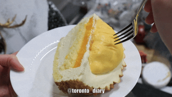 蛋糕胚是用加拿大本地农场的牛奶和鸡蛋做成的。最里层的榴莲肉,是马来西亚猫山王榴莲。